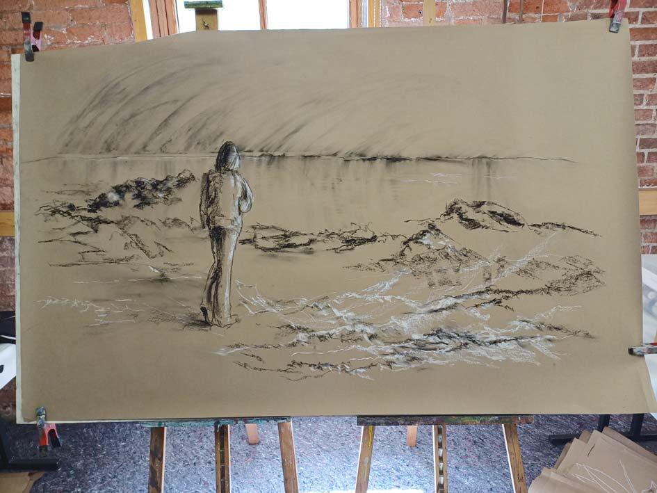 Für Zeichnende sind Formate zwischen kleinen Postkartenmaßen und 50x70 cm "normal" - das ist bei mir auch so. Zwischendurch wage ich mich aber an Größen, die nicht so üblich sind - 70x180 cm haben die beiden stehenden Figuren (2022); die Querformate sind über zwei Meter breit (2023).